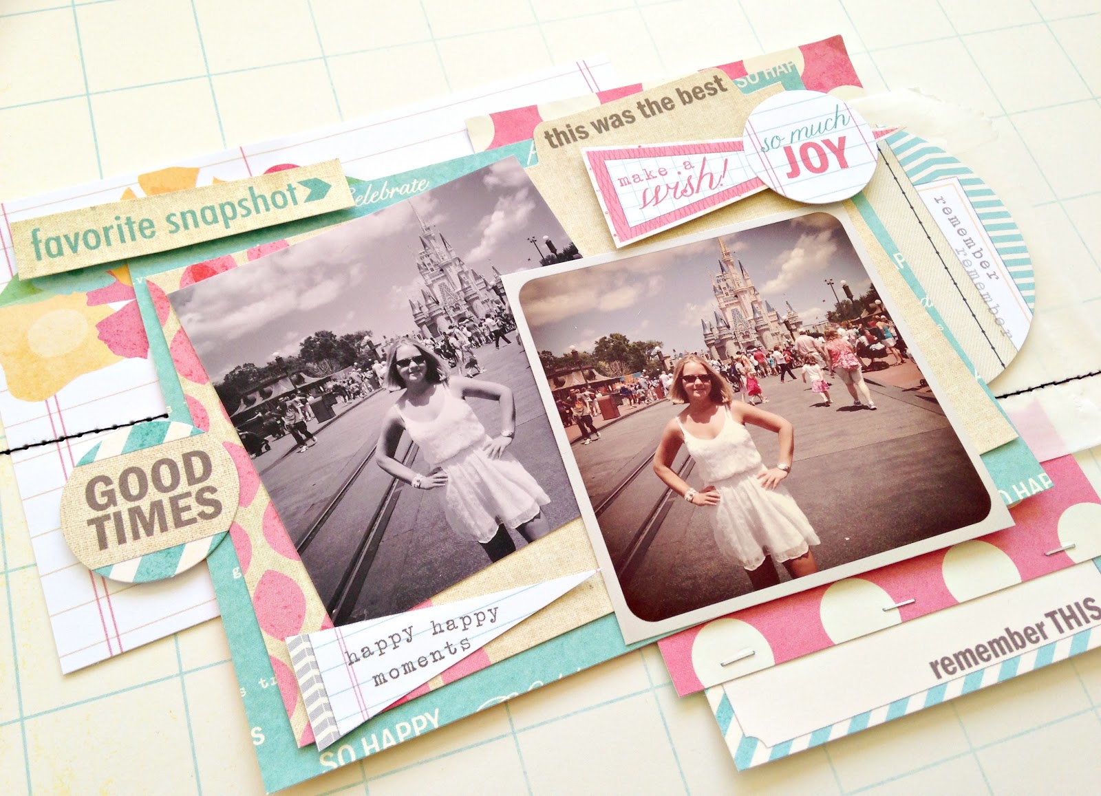 The Elle's Studio Serendipity collection is so much fun to play with and it was perfect for this vacation picture. The colors are cute and bright and the collection has many tags and labels to add to your project. I love the black faux stitches some of the papers and tags have, so I continued that with some black handstitching.